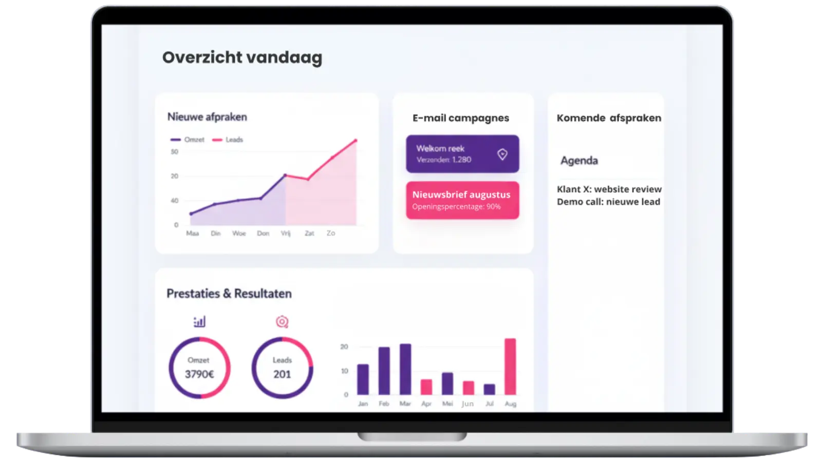 Alles op één plek: je afspraken, e-mailflows, reviewmanagement, website en CRM werken samen in één duidelijk platform. Jij bepaalt altijd zelf welke oplossing(en) je hierbinnen gebruiken wilt.