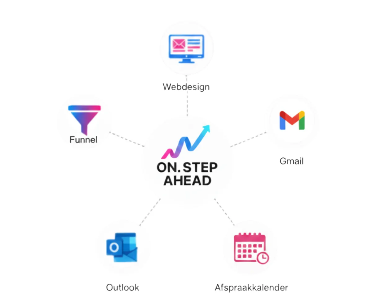 ON. Step Ahead helpt ondernemers groeien met websites, boekingssoftware en e-mailflows die samenkomen in één duidelijk systeem. Zo krijg jij een professionele uitstraling, minder handmatig werk en een geautomatiseerde klantopvolging voor maximale bedrijfsgroei.